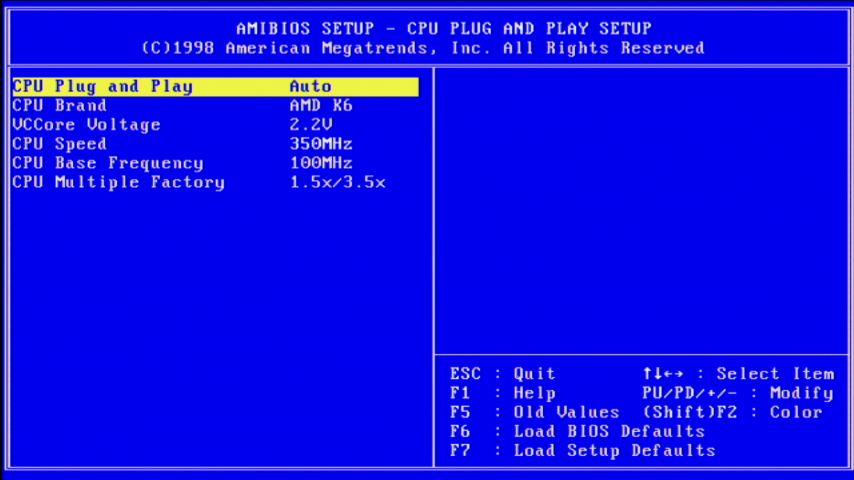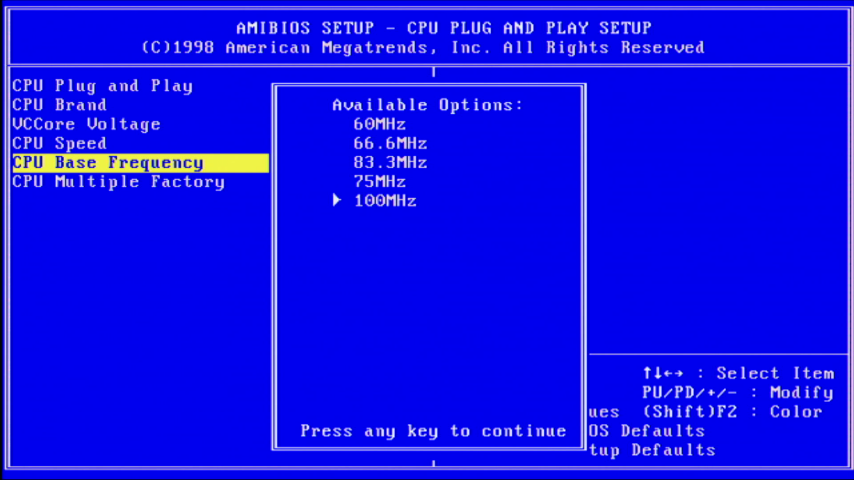 Interestingly, in the BIOS CPU Plug and Play Setup page, it doesn't actually refer to "AMD K6-2", only "AMD K6" - I guess it treats them the same; the CPU Speed options range from 166 MHz up to 500 MHz in 33 MHz increments (and several are repeated as they get to the same frequency using a different combination of FSB speed and multiplier). In "Auto" mode you can only select the eventual clock speed you want, but switching to "User Define" gives you access to adjust all the other options.