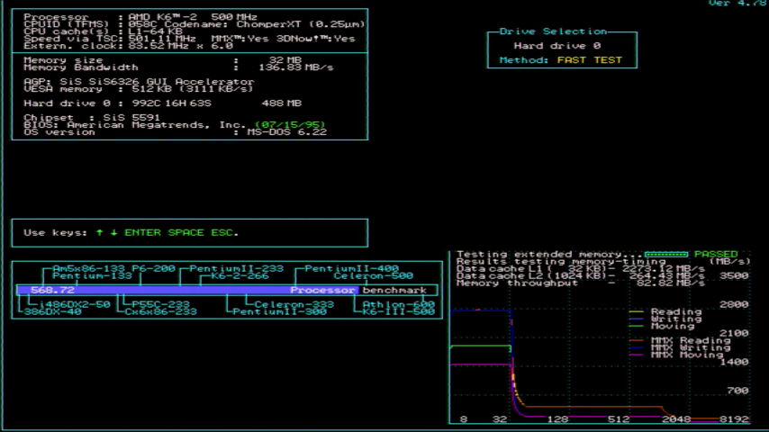 I went back to setting the FSB to 100 MHz and chose the 5.0x multiplier. The startup screen showed a 500 MHz K6-2, but in SpeedSys it again showed an FSB of 90 MHz resulting in a CPU speed of 450 MHz, and CacheChk with the CPU at 450 MHz on the 5x multiplier: