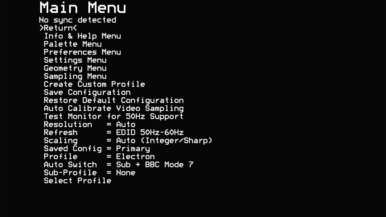 - Profiles - this allows all settings to be saved and recalled quickly for different requirements - great if you plan to use the RGBtoHDMI on a number of different systems, or in my case, a lot of different MDA/Hercules/CGA and EGA cards. Sub-profiles also exist to keep the menu system clean.