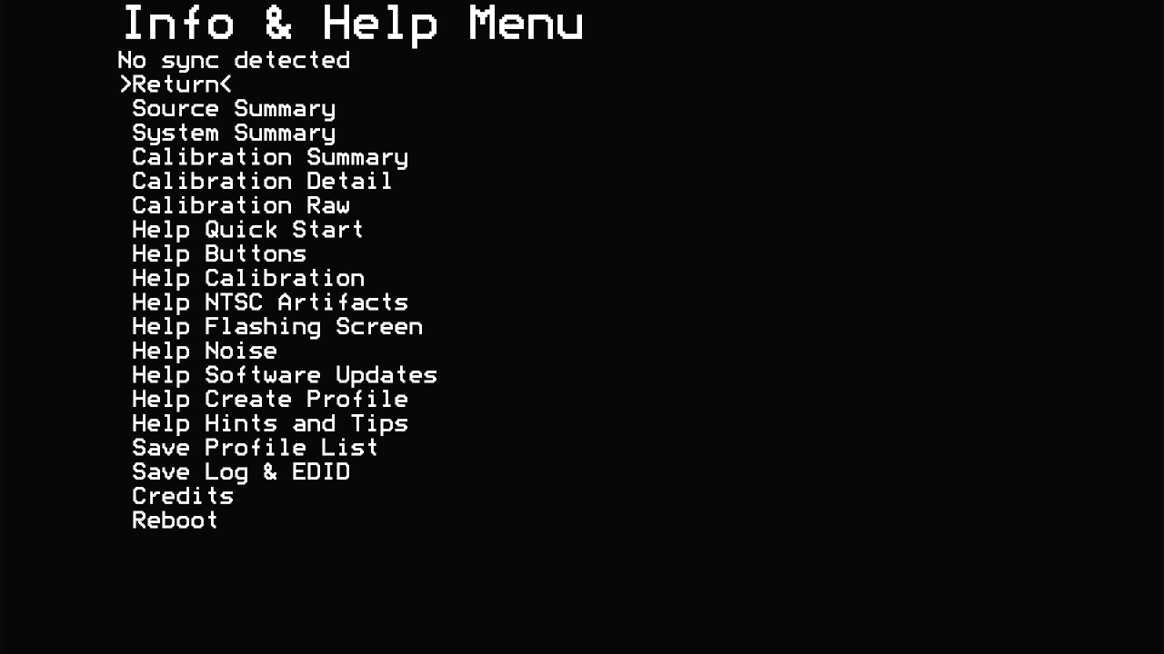 Without any source connected, you can still access the OSD by pressing SW1 (the leftmost button) on the top of the RGBtoHDMI, and then use SW2 and SW3 to move around the menus, with SW1 selecting an option. Here are some screenshots of the OSD: