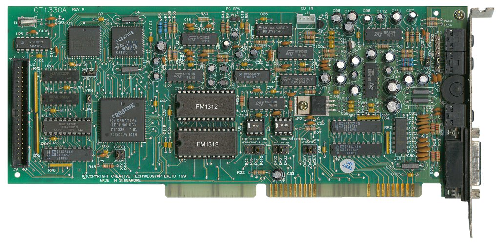 Model number CT1330 released in May 1991 was the first Creative card to comply with Microsoft's "MPC" standard. It added a mixer to provide a crude master volume control, high pass and low pass filter. It used a pair of Yamaha YM3812 chips to provide stereo music, although this was rarely used by games. It was fully Sound Blaster and Ad Lib compatible. The Pro also was the first card from Creative Labs to have a CD-ROM interface on-board. Most Pro cards support only the Panasonic (Matsushita/Panasonic) CD-ROM drives. The Pro is still an 8-bit ISA card, as all the previous Sound Blaster cards are, even though at first glance it looks like a 16-bit card because of the 'AT' section on the connector, but note that these are not wired to anything.
