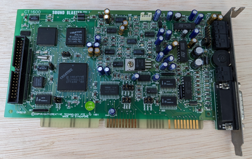 But what made it different was the "DSP", or Digital Sound Processor, which is what Creative Labs called the "digital audio" part of the card. This brand new feature brought the ability to play back mono sampled sound at up to 22 kHz sampling frequency (about the same as FM radio quality, so quite poor by today's standards), and record at 12 kHz (which was similar to AM radio quality - even worse). In reality, this transformed DOS games, as this sampled sound was used to introduce sound effects into games while simultaneously playing music via the OPL2 (FM synthesis) chip. For backward compatibility with the earlier C/MS a.k.a. Game Blaster card, the C/MS chips [as they became known] were installed in sockets on the board.