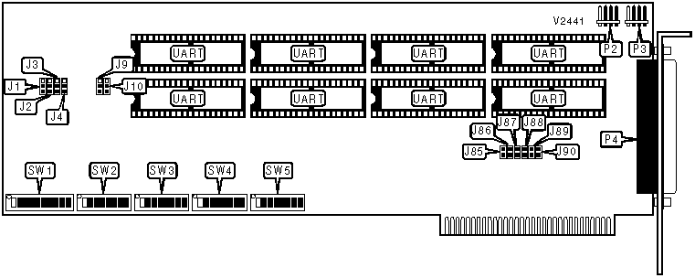 Note:When using the daisy-chain connectors, the board may only use one interrupt. Up to four boards may be daisy-chained. Daisy-chaining boards to operate as one unit will only function under MS-DOS and compatible operating systems. | ||