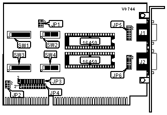 Note: A total of 8191 memory base address settings are available. The switches are a binary representation of the decimal addresses. Switch 2/5 is the Least Significant Bit and switch 1/1 is the Most Significant Bit. The switches have the following decimal values: switch 2/5=1, 2/4=2, 2/3=4, 2/2=8, 2/1=16, 1/8=32, 1/7=64, 1/6=128, 1/5=256, 1/4=512, 1/3=1024, 1/2=2048, 1/1=4096. Turn off the switches and add the off switches to obtain the correct memory base address. (On=0, Off=1)