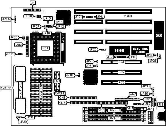 32-bit PCI slots (3), floppy drive interface, green PC connector, IDE interfaces (2), parallel port, PS/2 mouse port, serial ports (2), VRM connector