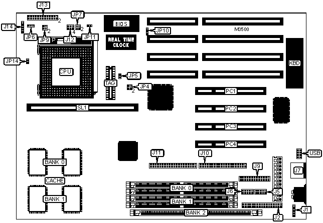 Note: Board accepts EDO memory. Bank 2 uses DIMM modules. The chip size and configuration is unidentified. | ||