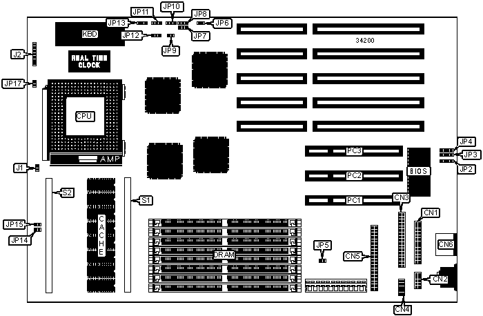 Note: Board accepts 256KB/512KB cache. 256KB is factory installed and is not configurable. To upgrade to 512KB, install cache module at S1/S2. The size and actual configuration of the module is unidentified.