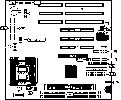 32-bit PCI slots (3), floppy drive interface, IDE interfaces (2), parallel port, PS/2 mouse interface, serial ports (2), IR connector, USB connector, ATX power connector, AGP slot