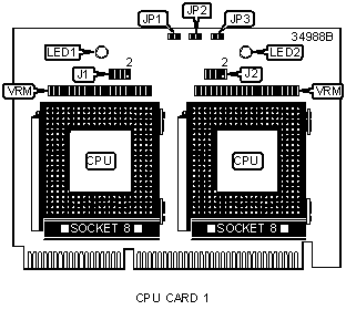 Note: The LEDs on CPU Card 1 and CPU Card2 are ‘overheat’ indicators. If any of these LEDs come on on either card, turn computer off as soon as possible to prevent damage. Note: If installing CPU card 1 only, insert the terminator card in CPU socket 2. Do not use CPU card 2 only |