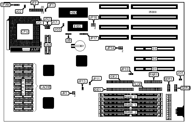 32-bit PCI slots (3), floppy drive interface, green PC connector, IDE interface (2),