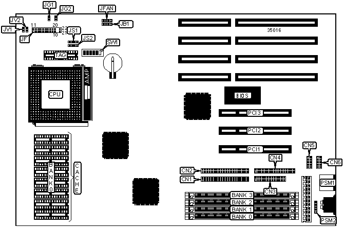 PS/2 mouse port, PS/2 mouse connector, parallel port, serial ports (2), IDE interfaces (2), floppy drive interface, green PC connector, 32-bit PCI slots (3)