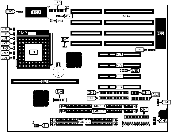 Note: Board accepts EDO memory. Banks 0 & 1 are interchangeable. Board does not accept SDRAM. | |||