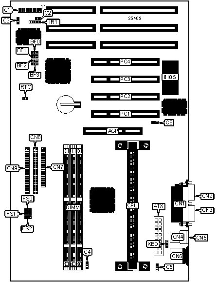 32-bit PCI slots (4), floppy drive interface, green PC connector, IDE interfaces (2), parallel port, PS/2 mouse port, serial ports (2), IR connector, USB connectors (2), ATX power connector, AGP slot |