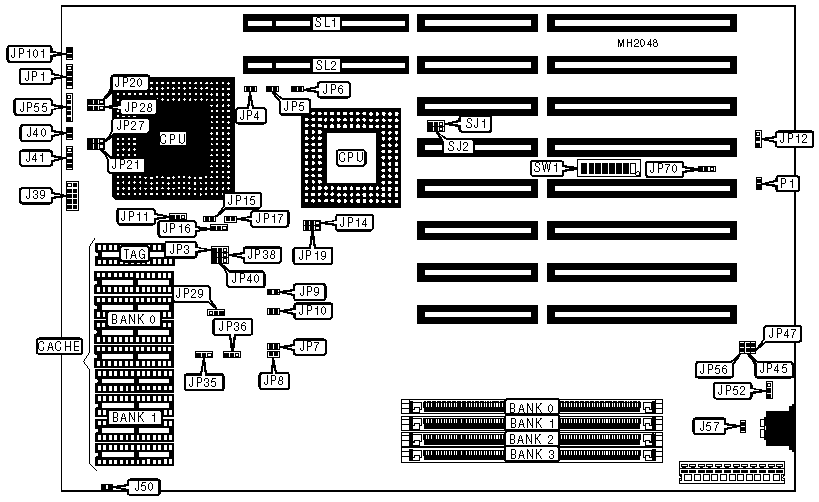 Note: This board was manufactured with either 8 banks of 30 pin SIMM sockets or 4 banks of 72 pin SIMM sockets. Mainboard drawing depicts 72 pin SIMM sockets. If mainboard has 30 pin SIMM sockets, use the above table.