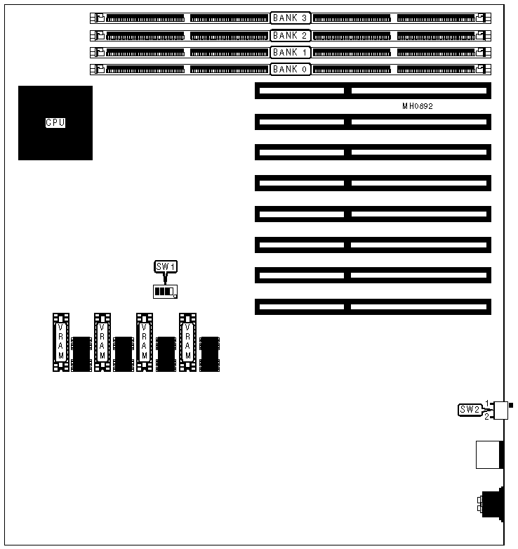 Note:SW1 and SW2 are located on the main board (shown on previous page). SW3 is on the I/O Adapter Board (shown below). | |||