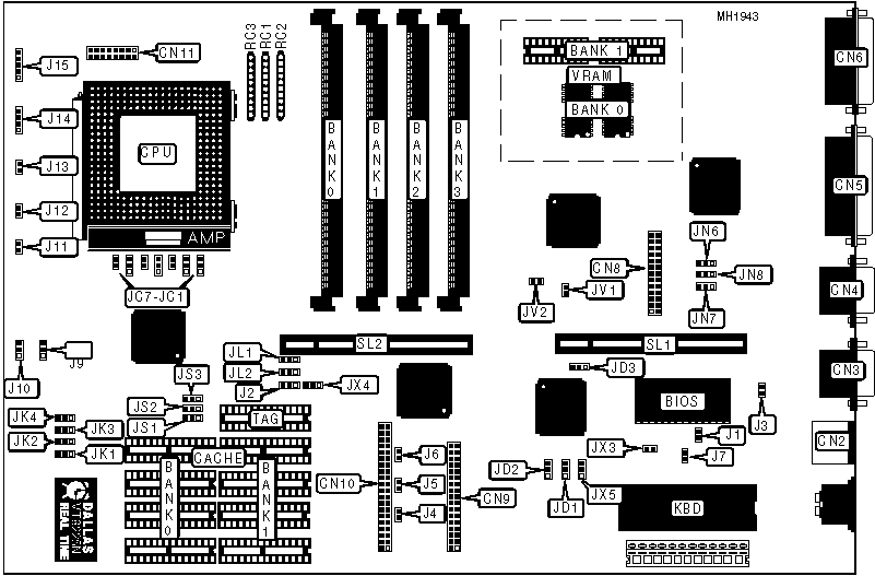 3.3V Daughter board connector, 32-bit VESA local bus slot, floppy drive interface,IDE interface, parallel port, PS/2 mouse port, serial ports (2), VGA feature connector, VGA port |