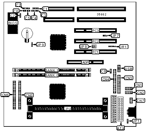 32-bit PCI slots (3), floppy drive interface, IDE interfaces (2), parallel port, PS/2 mouse interface, serial ports (2), IR connector, USB connector, ATX power connector, AGP slot, SB-link connector, wake on LAN connector
