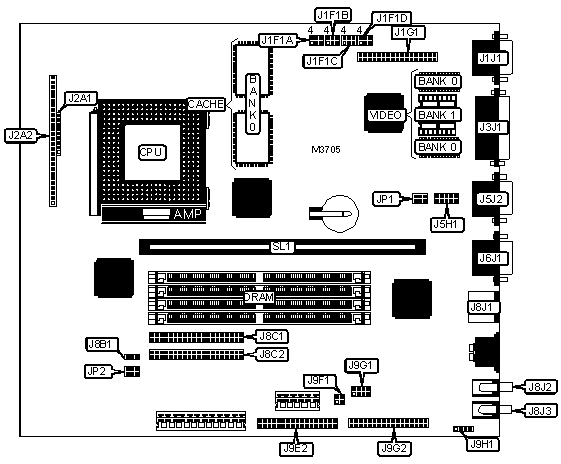 Note: Board accepts EDO memory. Board also accepts x 32 SIMMs. The location of banks 0 & 1 are unidentified. | ||