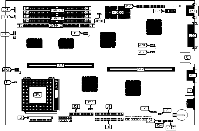 Note: Board accepts EDO memory. Board also accepts x 32 SIMMs. Banks are interchangeable.