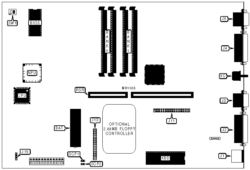 Floppy drive interface, IDE interface, parallel port, serial ports (2), VGA port