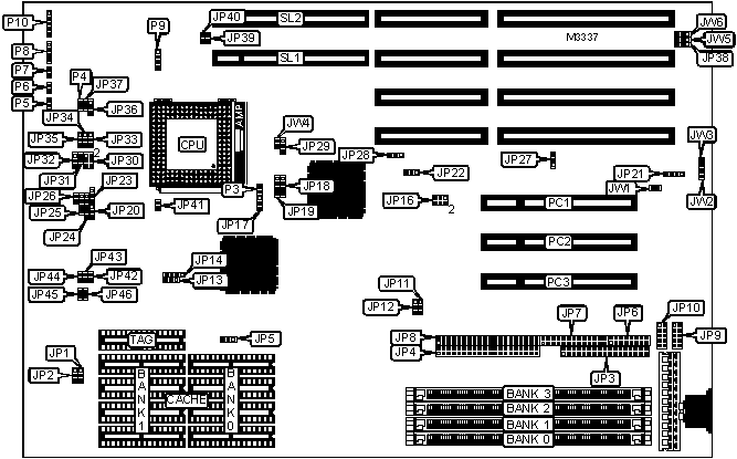 32-bit VESA local bus slots (2), 32-bit PCI slots (3), floppy drive interface, game interface, IDE interfaces (2), parallel port, serial ports (2)