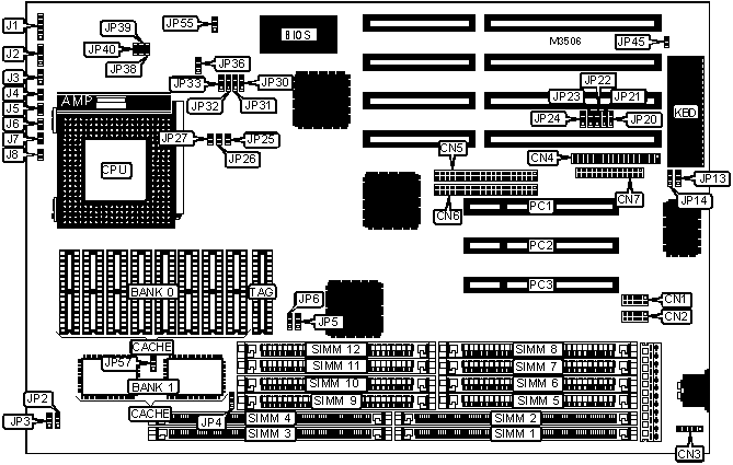 Note: Bank 0 = SIMM 5 - 8. Bank 1 = SIMM 2. Board accepts EDO memory. Board also accepts x 32 SIMMS. | ||