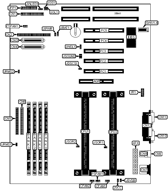 32-bit PCI slots (5), floppy drive interface, IDE interfaces (2), SCSI interface, Wide SCSI interface (2), parallel port, PS/2 mouse port, serial ports (2), IR connector, USB connectors (2), ATX power connector, AGP slot |