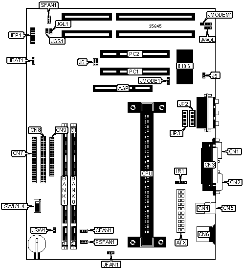32-bit PCI slots (2), floppy drive interfaceIDE interfaces (2), parallel port, PS/2 mouse port, serial ports (2), IR connector, USB connectors (2), ATX power connector, AGP slot |