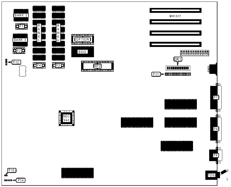 Note:Parity sockets P1, P2, P3, and P4 are not used and should be left open. DRAM banks are soldered to the board, and should not be altered. | ||||||