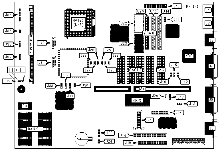 Note:If board is factory installed with 1MB of VRAM, a second 256K x 16 DIP will soldered on the board at U22. If board is factory configured with 512KB of VRAM, U22 will only be a trace, and a 40-pin ZIP socket will be installed at location U20. If the ZIP socket is present, there will also be traces for 2 additional zip sockets at U14 and U16. Sockets installed on ZIP socket traces will not function. | |||