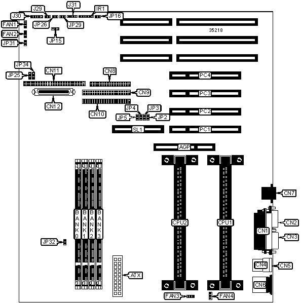32-bit PCI slots (4), Ethernet connector, floppy drive interface, green PC connector, IDE interfaces (2), Narrow SCSI interface, Wide SCSI interface, parallel port, PS/2 mouse port, serial ports (2), IR connector, USB connectors (2), ATX power connector, AGP slot, RAID slot