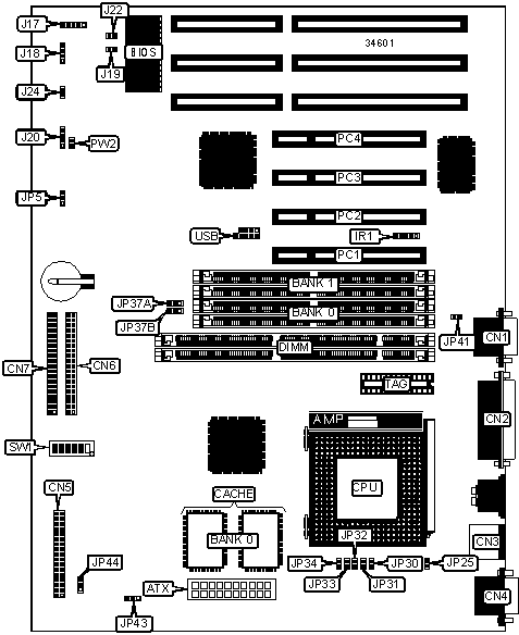 32-bit PCI slots (4), floppy drive interface, IDE interfaces (2), parallel port, PS/2 mouse port, serial ports (2), IR connector, USB connector, ATX connector