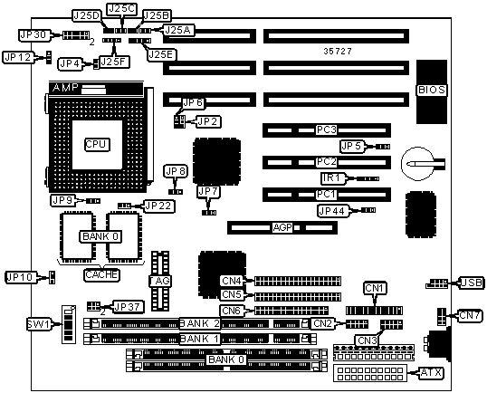 32-bit PCI slots (3), floppy drive interface, IDE interfaces (2), parallel port, PS/2 mouse interface, serial ports (2), IR connector, USB connector, ATX power connector, AGP slot, wake on LAN connector