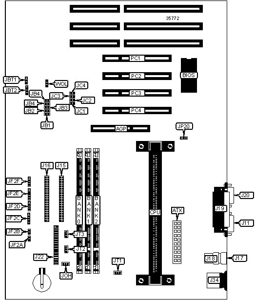 32-bit PCI slots (4), floppy drive interface, IDE interfaces (2), parallel port, PS/2 mouse port, serial ports (2), IR connector, USB connectors (2), ATX power connector, AGP slot