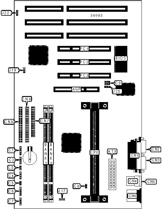 32-bit PCI slots (3), floppy drive interface, IDE interfaces (2), parallel port, PS/2 mouse port, serial ports (2), IR connectors (2), USB connectors (2), ATX power connector, AGP slot, SB-link connector