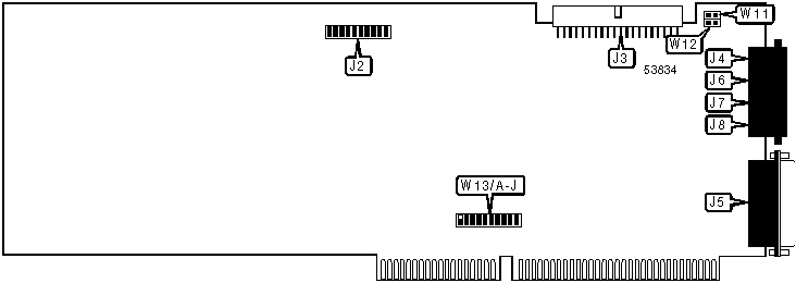 Note: A total of 1023 base address settings are available. The jumpers are a binary representation of the decimal memory addresses. W13/A is the Most Significant Bit and jumper W13/J is the Least Significant Bit. The jumpers have the following decimal values: W13/A=512, W13/B=256, W13/C=128, W13/D=64, W13/E=32, W13/F=16, W13/G=8, W13/H=4, W13/I=2, W13/J=1. Open the jumpers and add the values of the open jumpers to obtain the correct memory address. (Open=1, Closed=0)