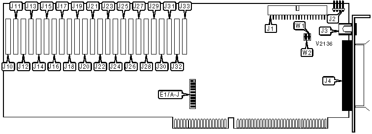 Note: A total of 2047 base address settings are available. The jumpers are a binary representation of the decimal memory addresses. E1/A is the Most Significant Bit and jumper E1/J is the Least Significant Bit. The jumpers have the following decimal values: E1/A=512, E1/B=256, E1/C=128, E1/D=64, E1/E=32, E1/F=16, E1/G=8, E1/H=4, E1/I=2, E1/J=1. Open the jumpers and add the values of the open jumpers to obtain the correct memory address. (Open=1, Closed=0) | |||||||||||