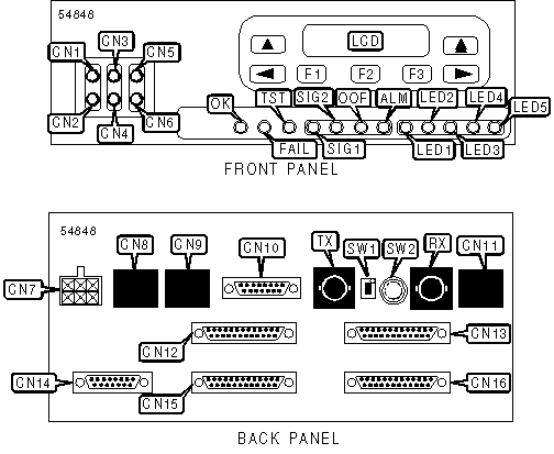 BNC connectors (2), auxiliary port (RJ-48), communication port (RJ-48), HDSL network interface via RJ-48 connector, test jacks (6), power jack,