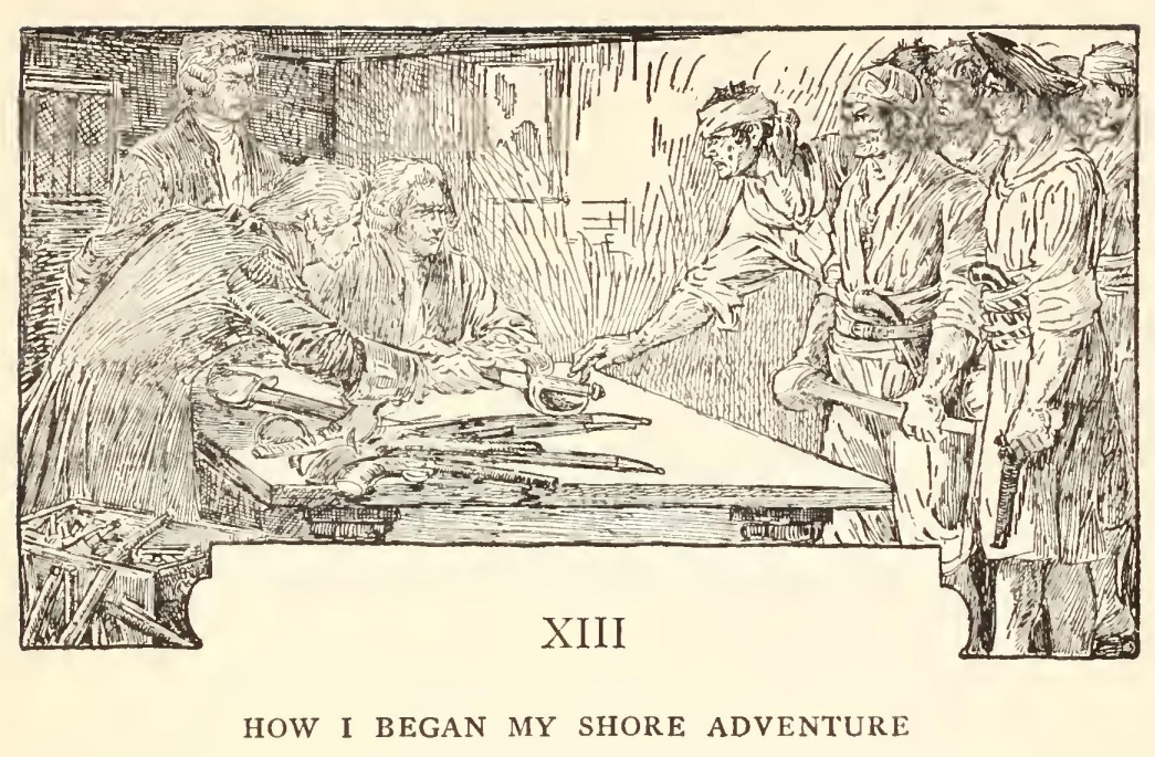 It was one January morning, very early—a pinching, frosty morning—the cove all grey with hoar-frost, the ripple lapping softly on the stones, the sun still low and only touching the hilltops and shining far to seaward. The captain had risen earlier than usual and set out down the beach, his cutlass swinging under the broad skirts of the old blue coat, his brass telescope under his arm, his hat tilted back upon his head. I remember his breath hanging like smoke in his wake as he strode off, and the last sound I heard of him as he turned the big rock was a loud snort of indignation, as though his mind was still running upon Dr. Livesey.