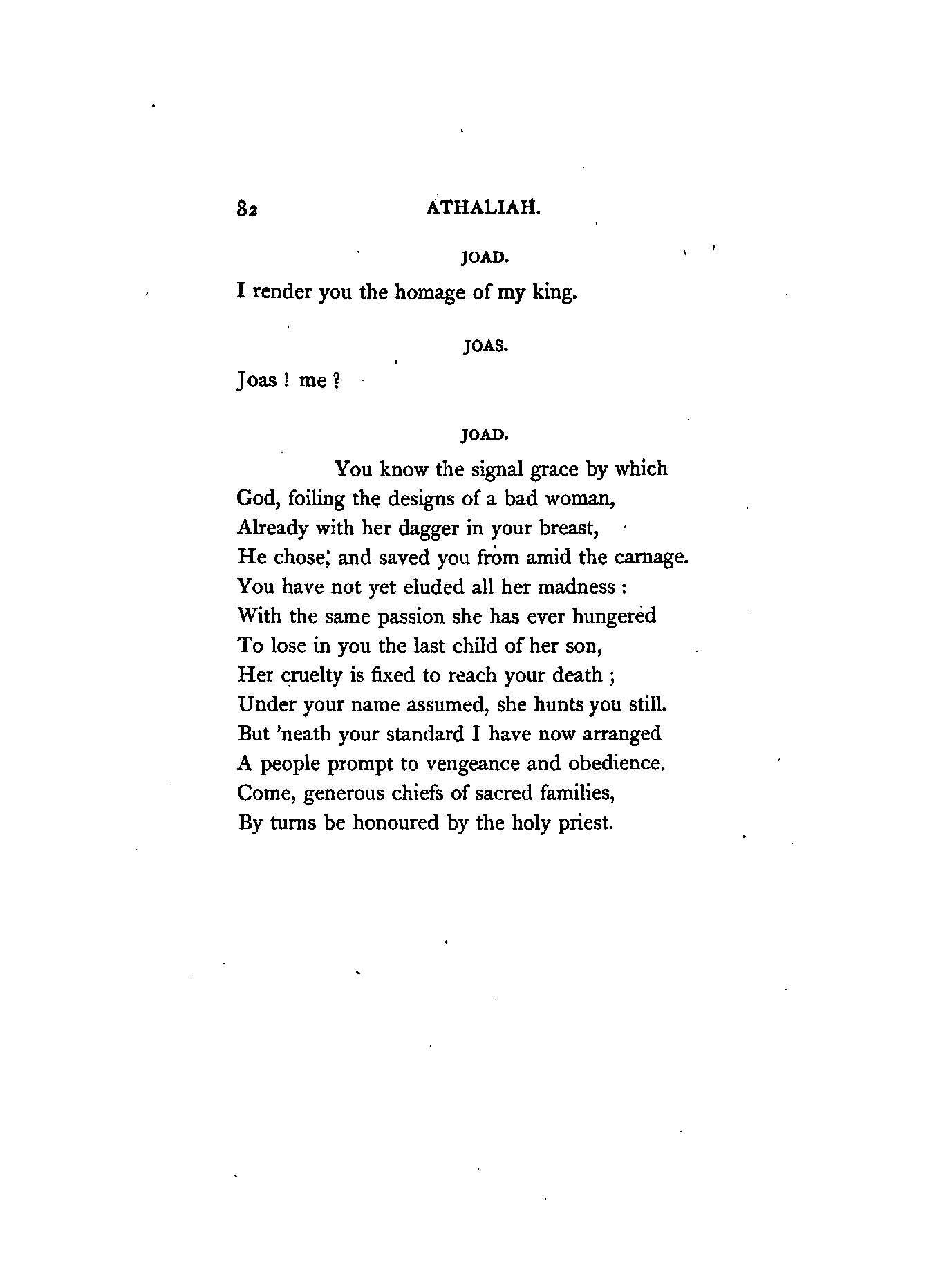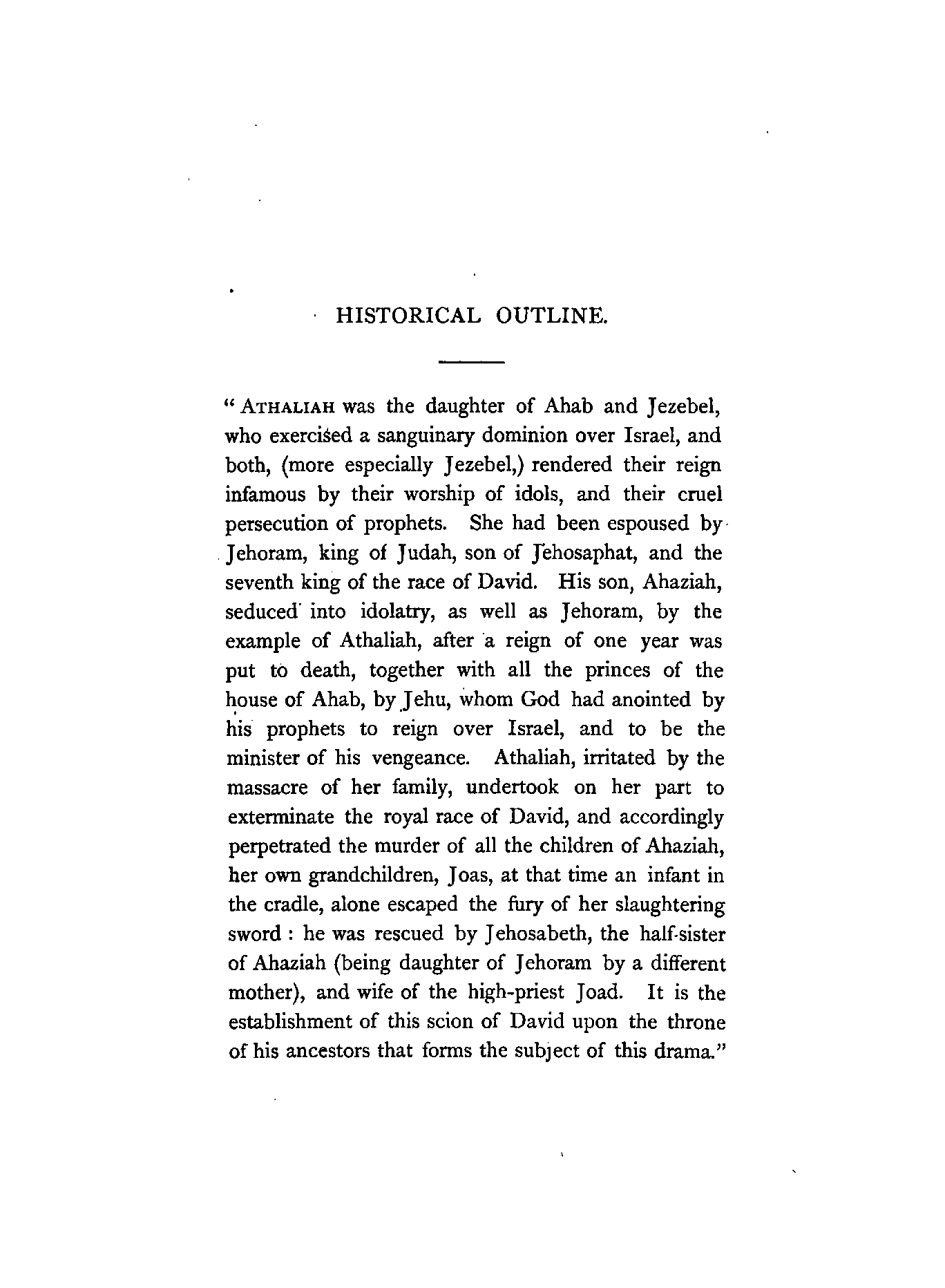 "Athaliah was the daughter of Ahab and Jezebel, who exercised a sanguinary dominion over Israel, and both, (more especially Jezebel,) rendered their reign infamous by their worship of idols, and their cruel persecution of prophets. She had been espoused by Jehoram, king of Judah, son of Jehosaphat, and the seventh king of the race of David. His son, Ahaziah, seduced into idolatry, as well as Jehoram, by the example of Athaliah, after a reign of one year was put to death, together with all the princes of the house of Ahab, by Jehu, whom God had anointed by his prophets to reign over Israel, and to be the minister of his vengeance. Athaliah, irritated by the massacre of her family, undertook on her part to exterminate the royal race of David, and accordingly perpetrated the murder of all the children of Ahaziah, her own grandchildren, Joas, at that time an infant in the cradle, alone escaped the fury of her slaughtering sword: he was rescued by Jehosabeth, the half-sister of Ahaziah (being daughter of Jehoram by a different mother), and wife of the high-priest Joad. It is the establishment of this scion of David upon the throne of his ancestors that forms the subject of this drama."