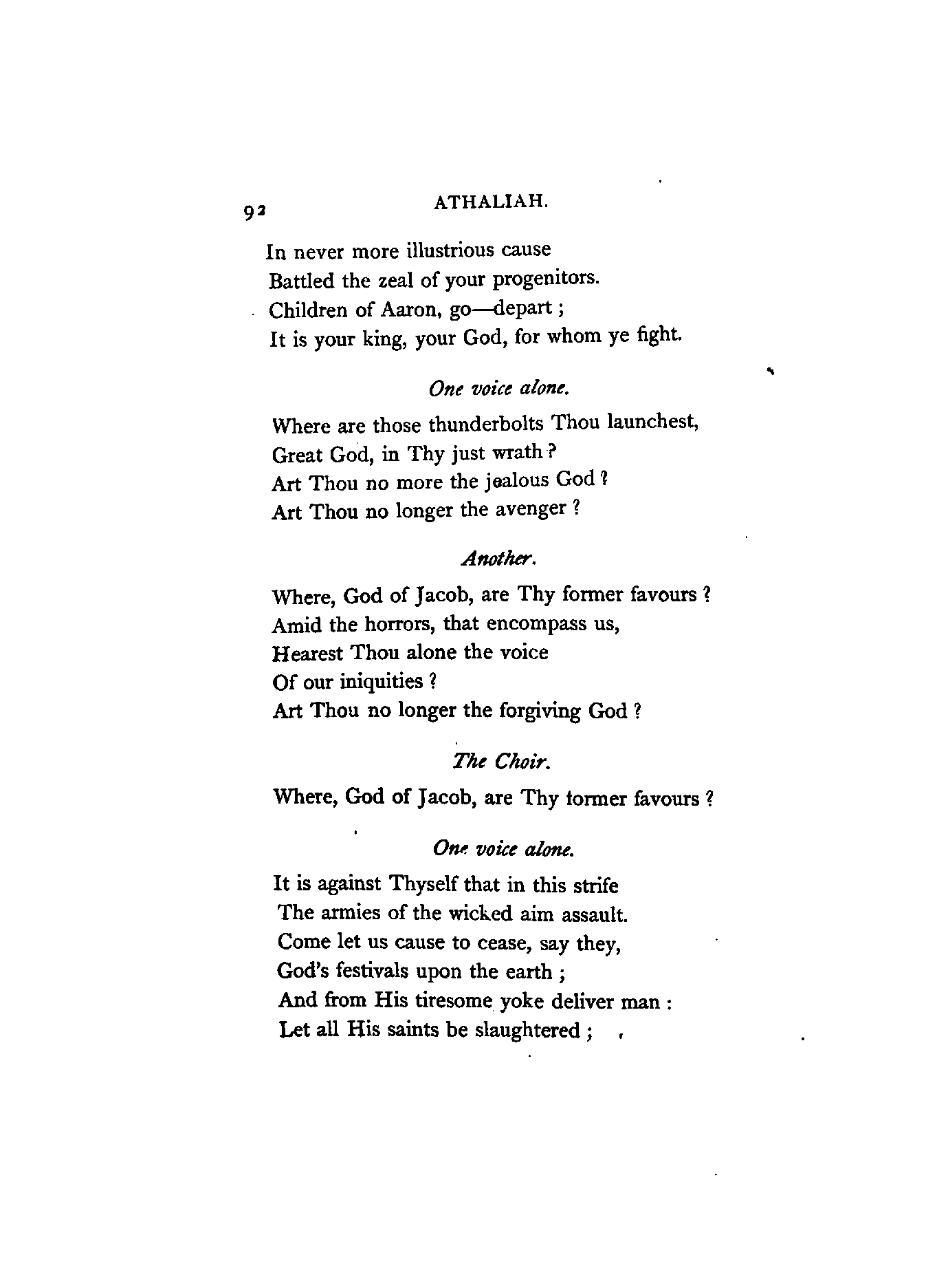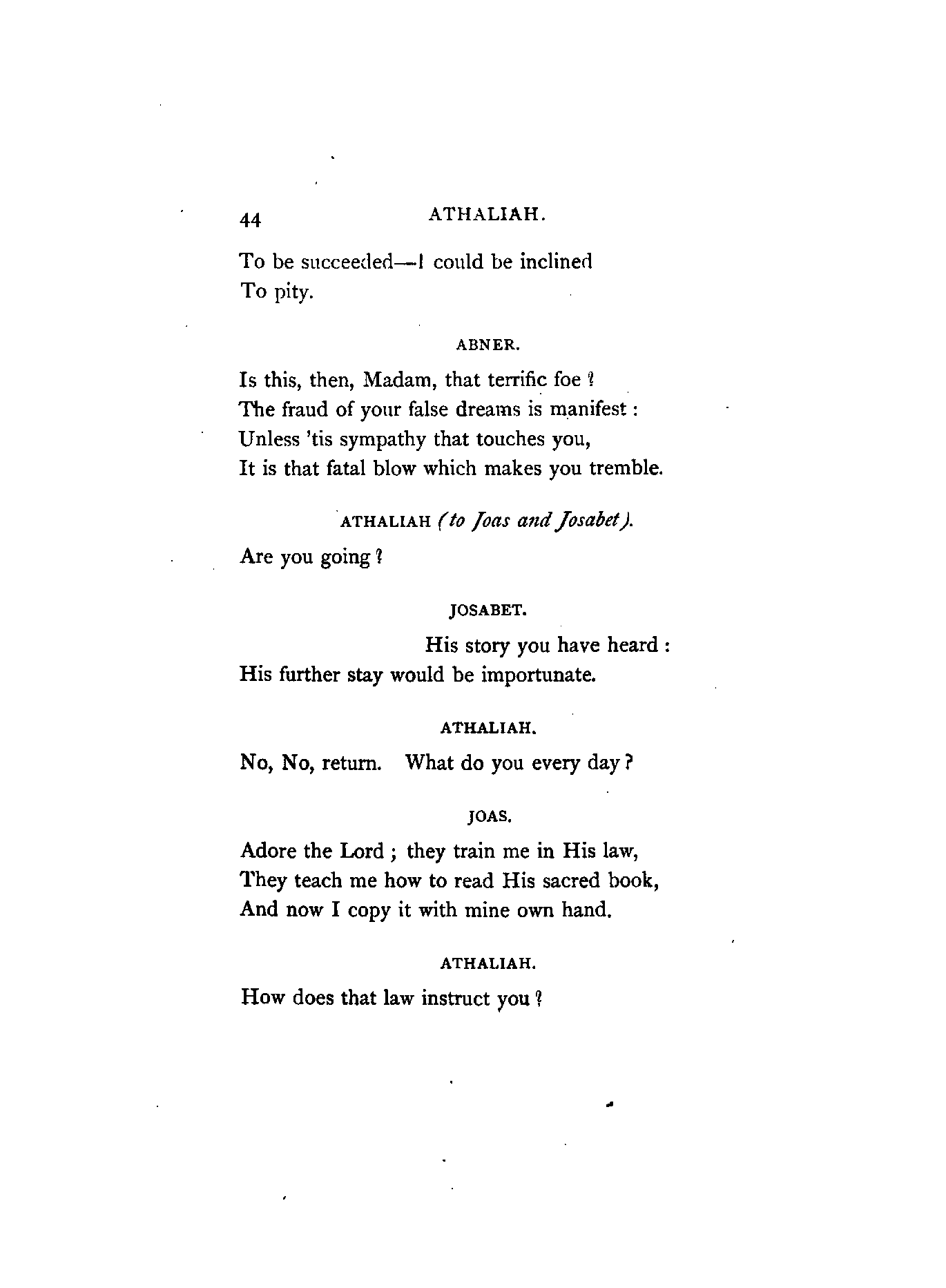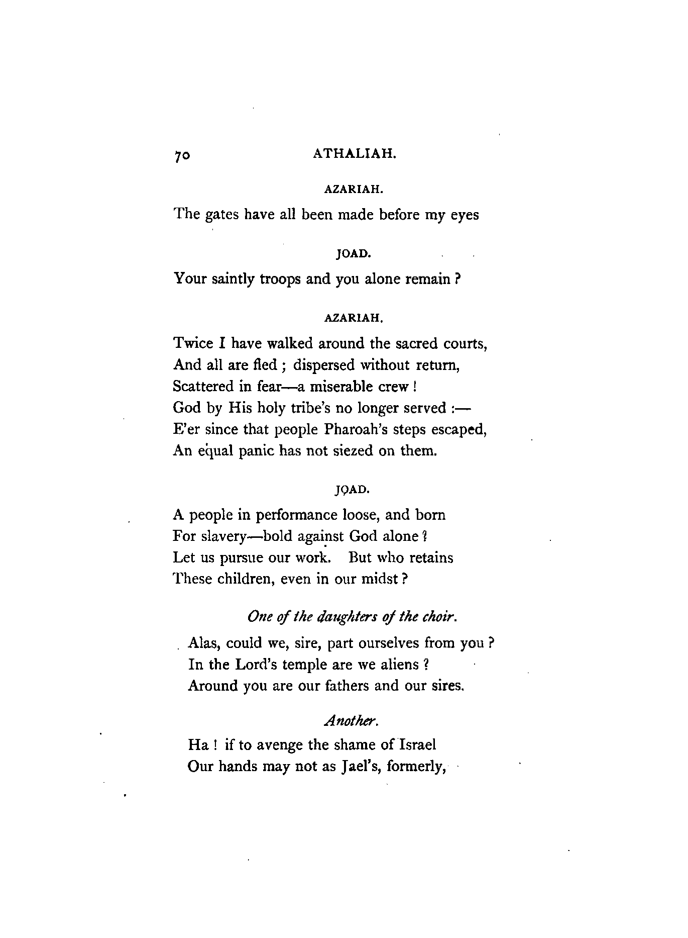 I have retained several of the French names, on account of their measure and euphony. Joas and Joad I have, I believe, invariably versified as one syllable, and Baal also, with one exception, which occurs in the first page; these words, to my judgment, being scarcely of greater quantity than thought, wrought, brought, &c.