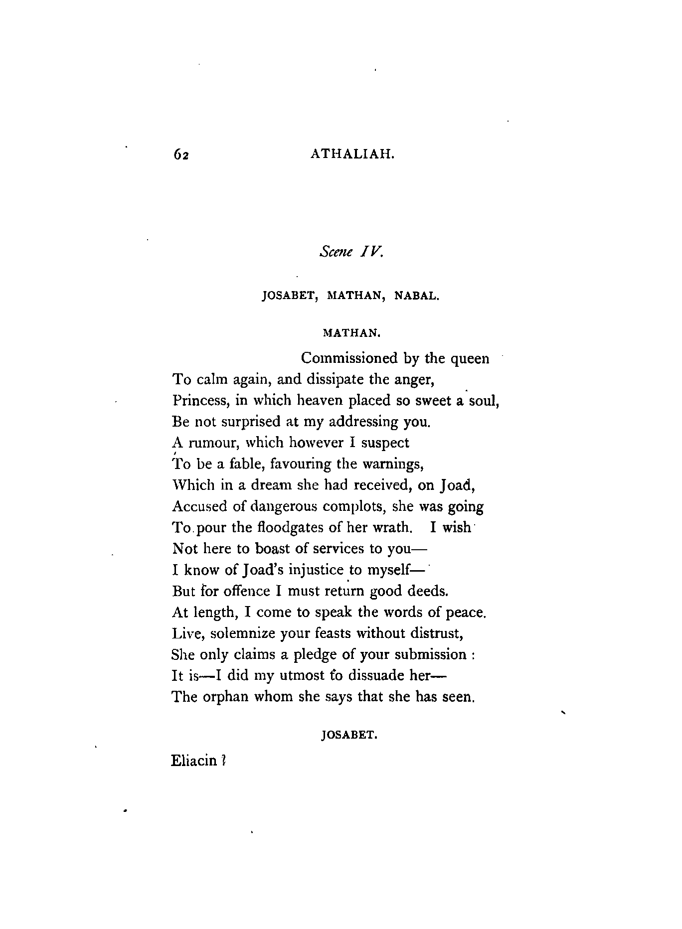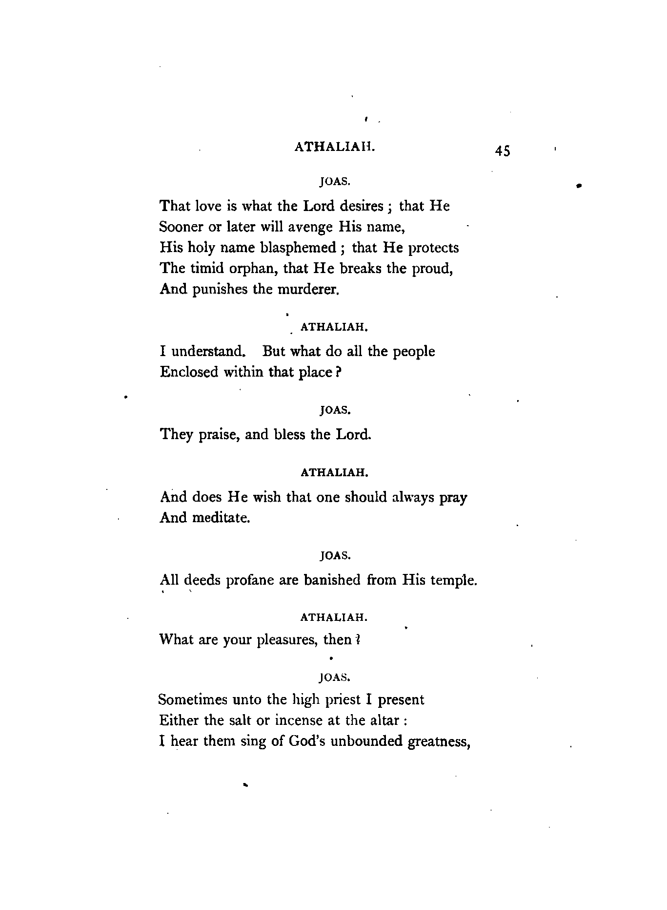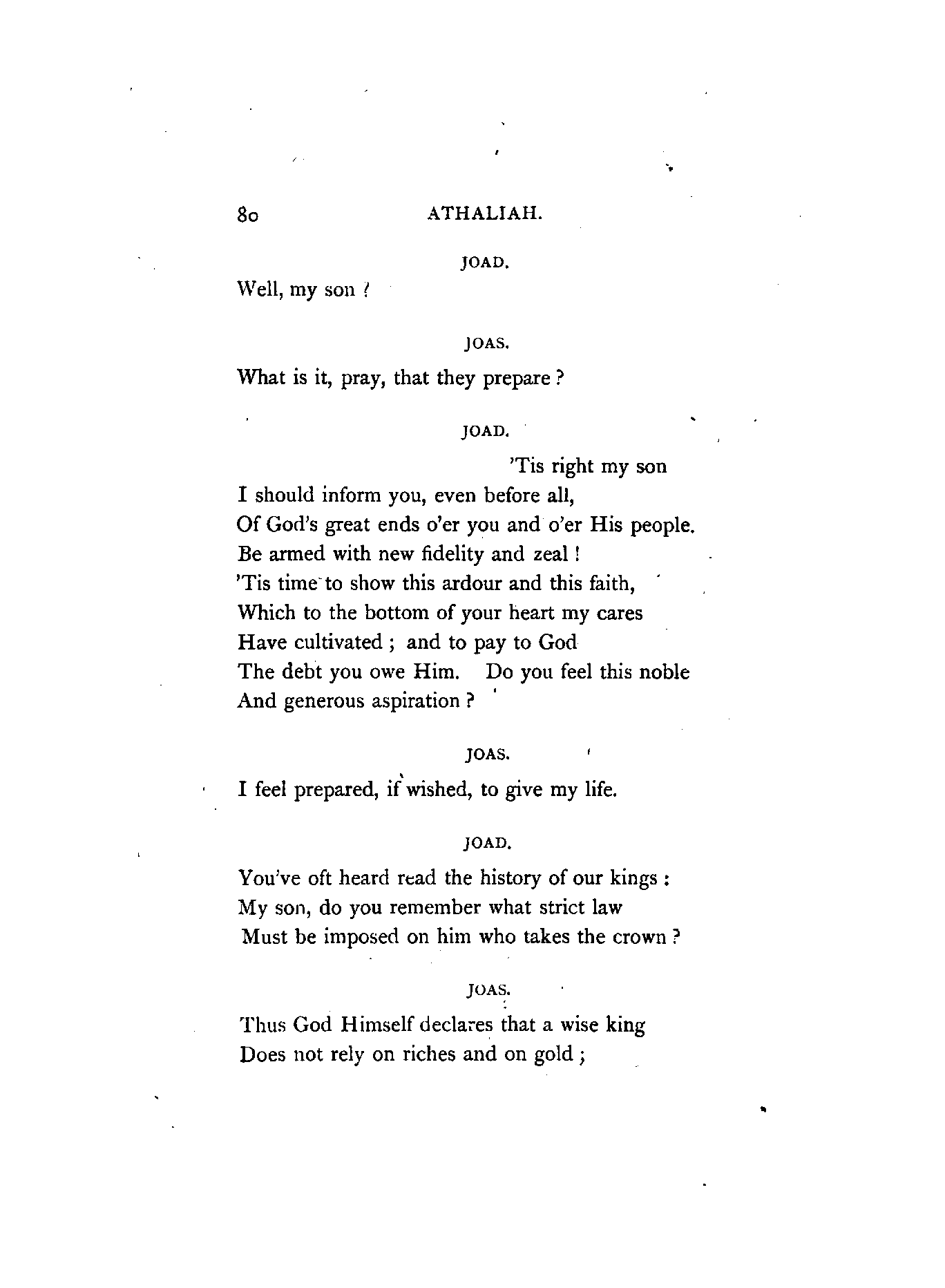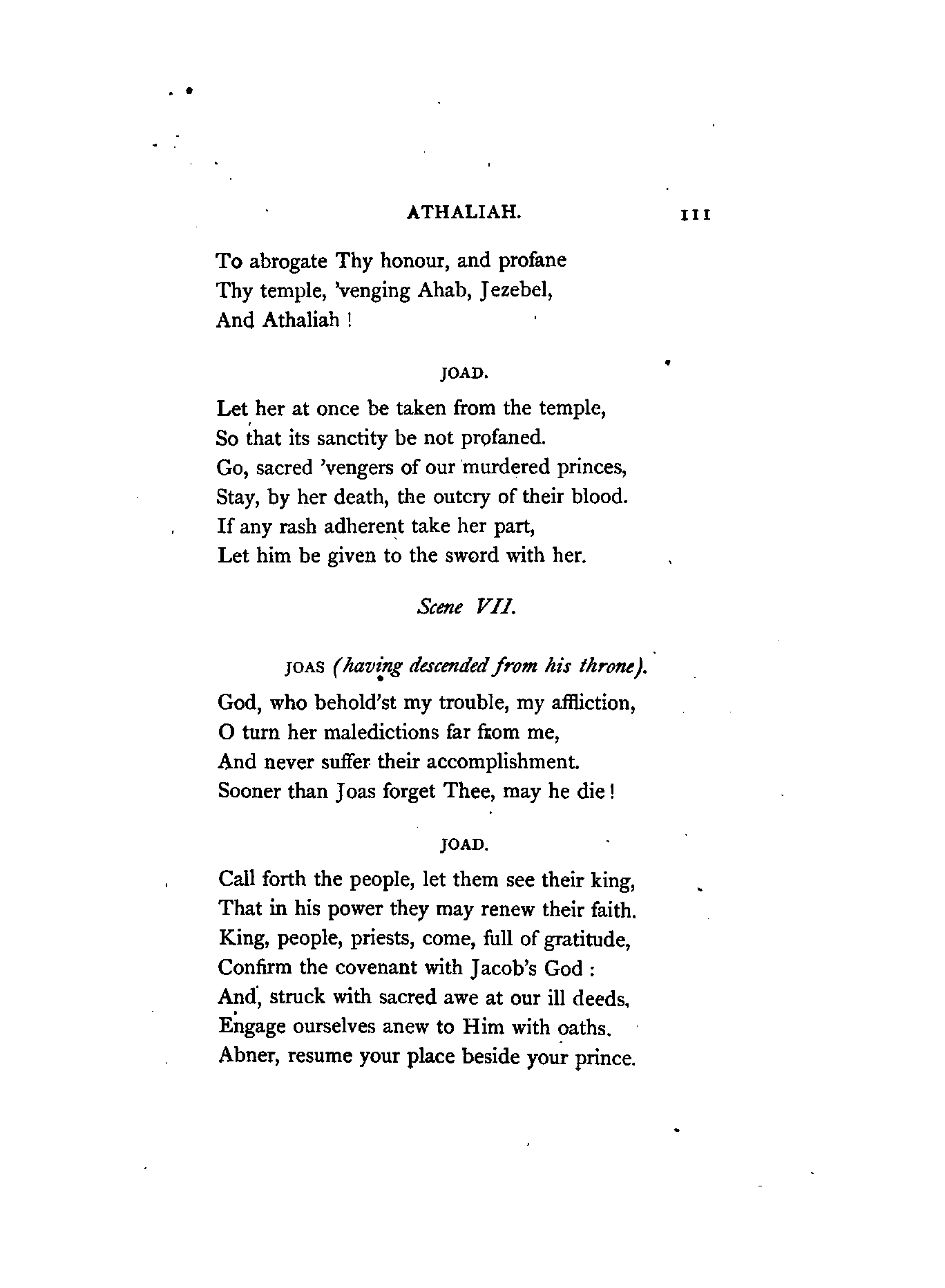 Racine, the author of Athalie (Athaliah), flourished in the latter half of the 17th century. At his appearance, Corneille, the great French Dramatist, was in the full splendour of his fame, whose rival he was afterwards recognised to be. Athalie is a Tragedy in rhyme, consisting of six Iambic feet, similar to the Alexandrine verse found occasionally in our English poets at the termination of a sentence or paragraph. Dryden, and a few others of less note, in the reign of Charles IL, introduced the rhyming drama to the English public; but the clank of its fetters was unpleasant to the British ear, which had become attuned to the freedom and majesty of blank verse. Blank verse, therefore, being our recognised vehicle of dramatic productions, has been employed in this translation. I did, however, intend in the first place to render the chorus into rhyme; but after maturer consideration it appeared to me that irregular blank verse would be more capable of tragic expression; and that it would also be more in harmony with the [4]Hebrew rhythm as represented by the scriptures, from which the plot was appropriated.