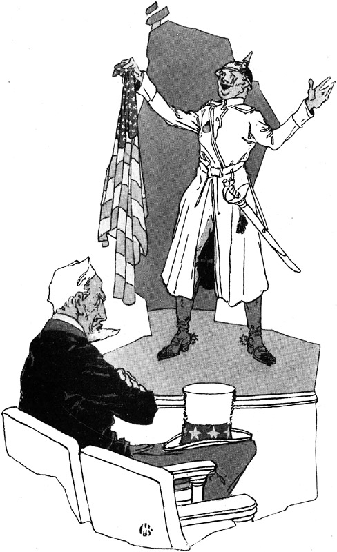 His vote cast in opposition to the will of the majority meant nothing; his voice raised in opposition meant much. For very soon the avowed pacifists and the secret protagonists of Kultur, the blood-eyed anarchists and the lily-livered dissenters, the conscientious objectors and the conscienceless I.W.W. group, saw in him a buttress upon which to stay their cause. The lone wolf wasn't [17]a lone wolf any longer—he had a pack to rally about him, yelping approval of his every word. Day by day he grew stronger and day by day the sinister elements behind him grew bolder, echoing his challenges against the Government and against the war. With practically every newspaper in America, big and little, fighting him; with every influential magazine fighting him; with the leaders of the Administration fighting him—he nevertheless loomed on the national sky line as a great sinister figure of defiance and rebellion.