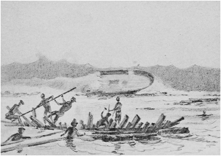 A line was formed across the reef and everything rescued was passed over the side and from hand to hand to the boats in the lagoon, for transfer to the island. Thus we stood waist-deep in the water, feet and ankles lacerated and bleeding, stumbling about the sharp and uneven coral rock, until five in the afternoon, and yet our spirits, which had been low in the dark, were so encouraged by a sight of a small portion of dry land and at least a temporary escape from a watery grave that now and then a jest or a laugh would pass along the line with some article that suggested a future meal.