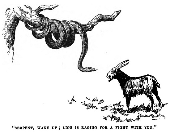A second time Bateta waked from sleep, and walked out to wonder at the intense brightness of the burning light that made the day. Then he looked around him, and his eyes rested upon a noble flock of goats and sheep, all of whom bleated their morning welcome, while the younglings pranced about in delight, and after curvetting around, expressed in little bleats the joy they felt at seeing their chief, Bateta. His attention was also called to the domestic fowls; there were red and white and spotted cocks, and as many coloured hens, each with its own brood of chicks. The hens trotted up to their master—cluck, cluck, clucking—the tiny chicks, following each its own mother—cheep, cheep, cheeping—while the cocks threw out their breasts and strutted grandly behind, and crowed with their trumpet throats, “All hail, master.”