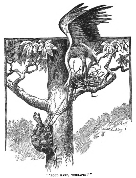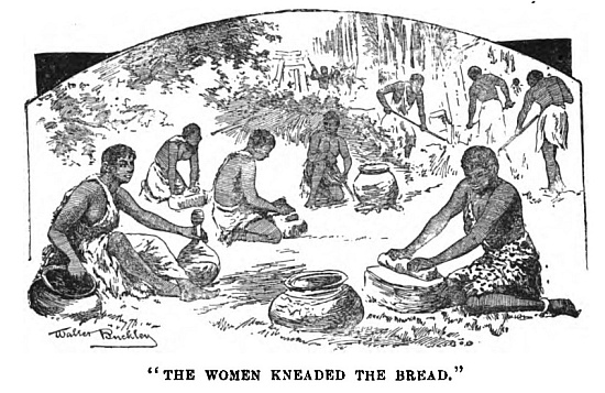 “Very well called, indeed,” said Moon. “These I give unto thee for meat. The buffalo is strong and fierce, leave him for thy leisure; but the goat, sheep, and fowls, shall live near thee, and shall partake of thy bounty. There are numbers in the woods which will come to thee when they are filled with their grazing and their pecking. Take any of them—either goat, sheep, or fowl—bind it, and chop its head off with thy hatchet. The blood will sink into the soil; the meat underneath the outer skin is good for food, after being boiled or roasted over the fire. Haste now, Bateta; it is meat thy wife craves, and she needs naught else to restore her strength. So prepare instantly and eat.”