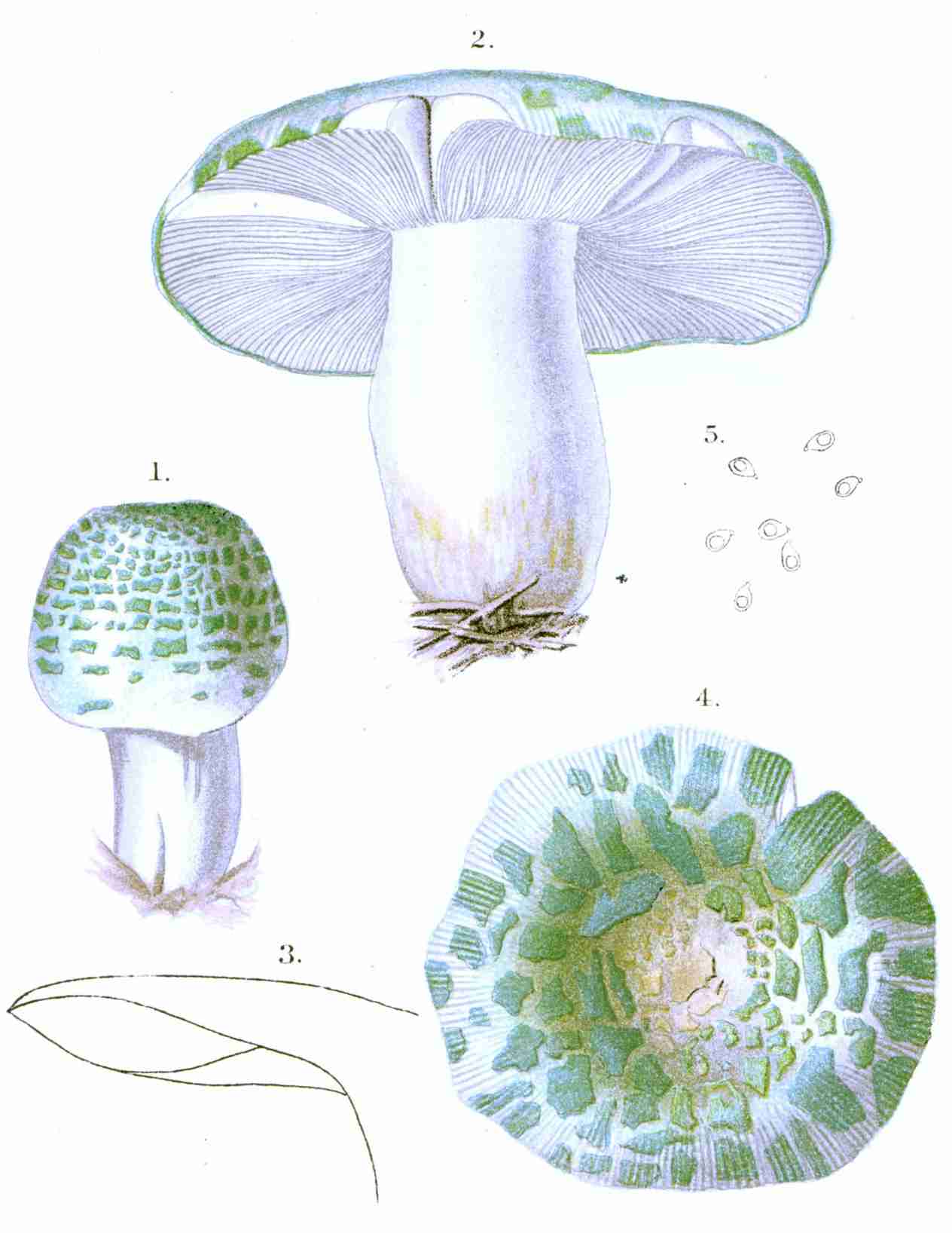 C. H. Peck, 5 groups: Leucosporii, white; Hyporhodii, salmon; Dermini, rust; Pratellæ, brown; Coprinarii, black.