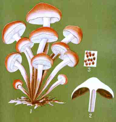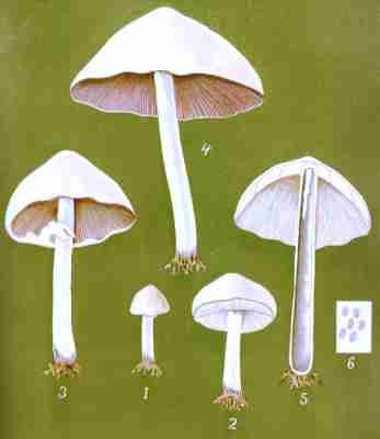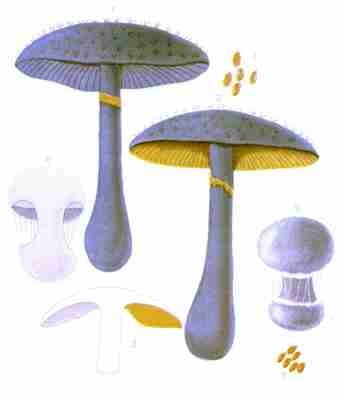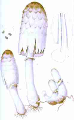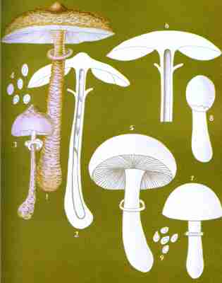 The veil is not a constant feature in the Agaricini, at least it is not always visible. When present it consists of a membrane which extends from the margin of the cap to the stem, veiling or protecting the gills. This membrane, called the cortina, has given its name to a numerous and [Pg 1-10]important class of mushrooms (the Cortinarias). It is generally white, soft, slightly spongy, cottony, at times fibrillose or even slightly fibrous, again in texture comparable to the spider's web, and may be even powdery or glutinous. It exists intact only in the youth of the plant. It is not visible in the developing mushroom, at least while the cap is closely pressed against the stem, but as the cap expands the membrane extends and finally breaks, leaving in some species its remnants upon the margin of the cap and upon the stem in the usual form of a ring or a mere zone. When the stem is not ringed the veil rises high upon the stalk, stretches across to meet the edges of the cap, and is afterwards reflected back over its whole surface.