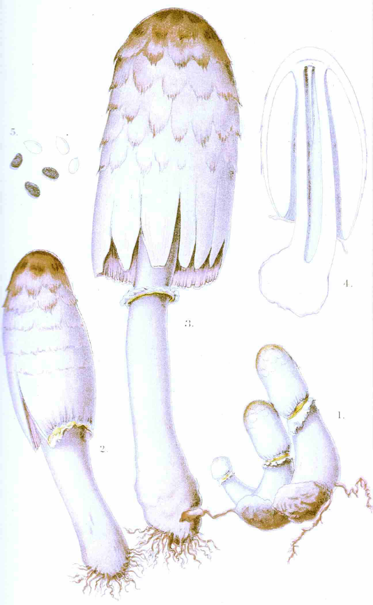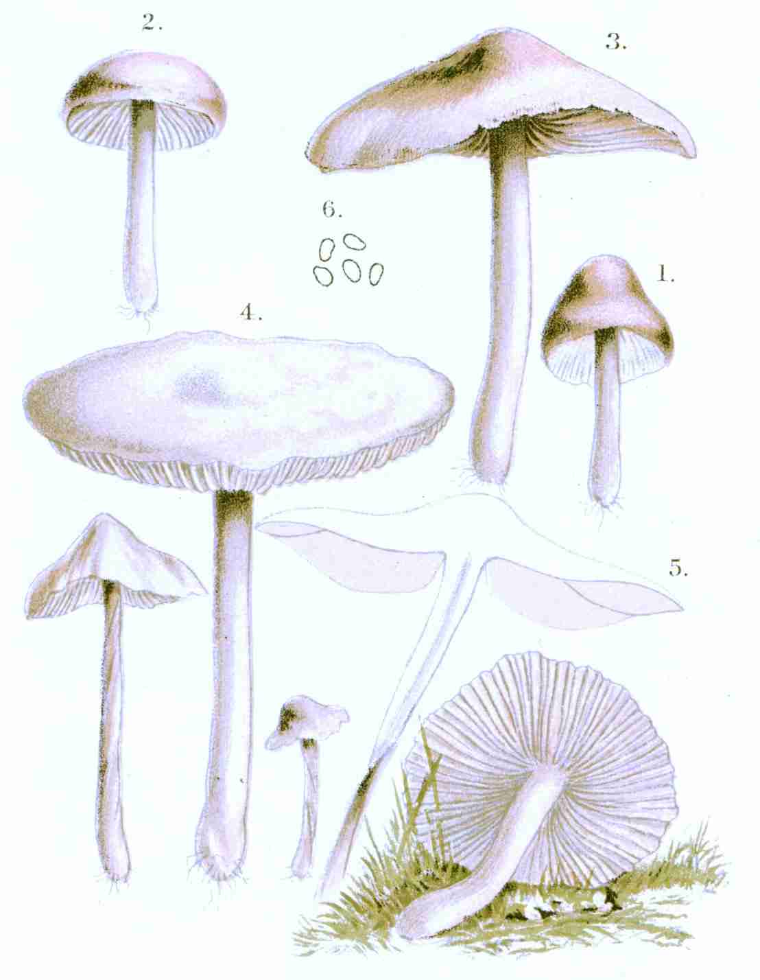 Rev. J. M. Berkeley, 5 groups: Very frequently pure white, but presenting also pink, various tints of brown, from yellowish and rufous to dark bister, purple-black, and finally black; Leucospori, white; Hyporhodii, salmon; Dermini, ferruginous; Pratellæ, brown; Coprinarius, black.