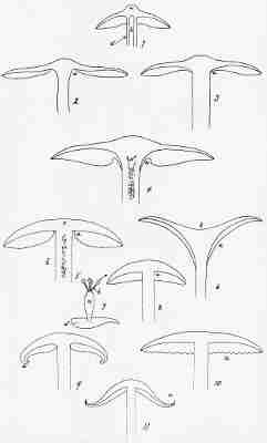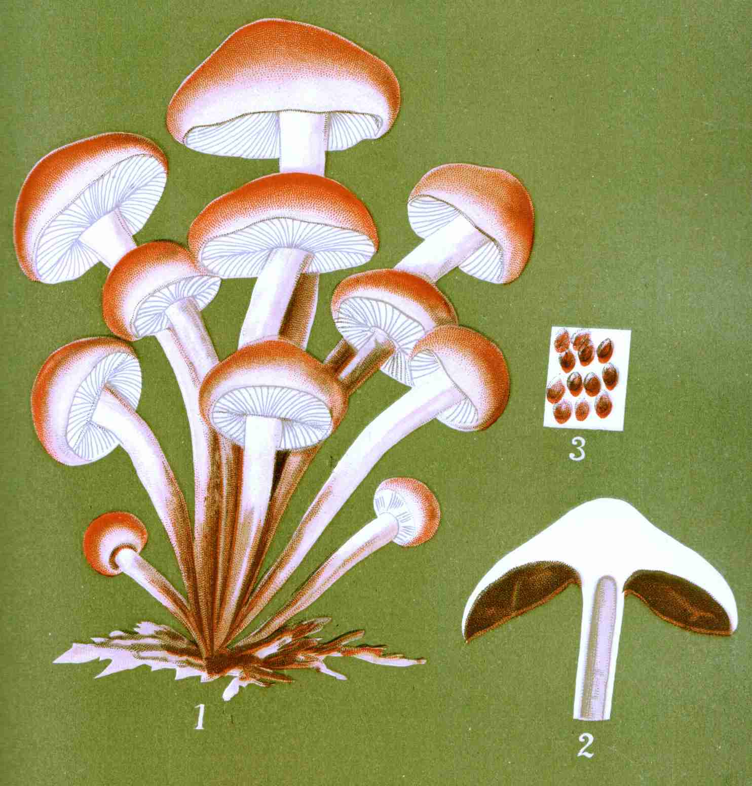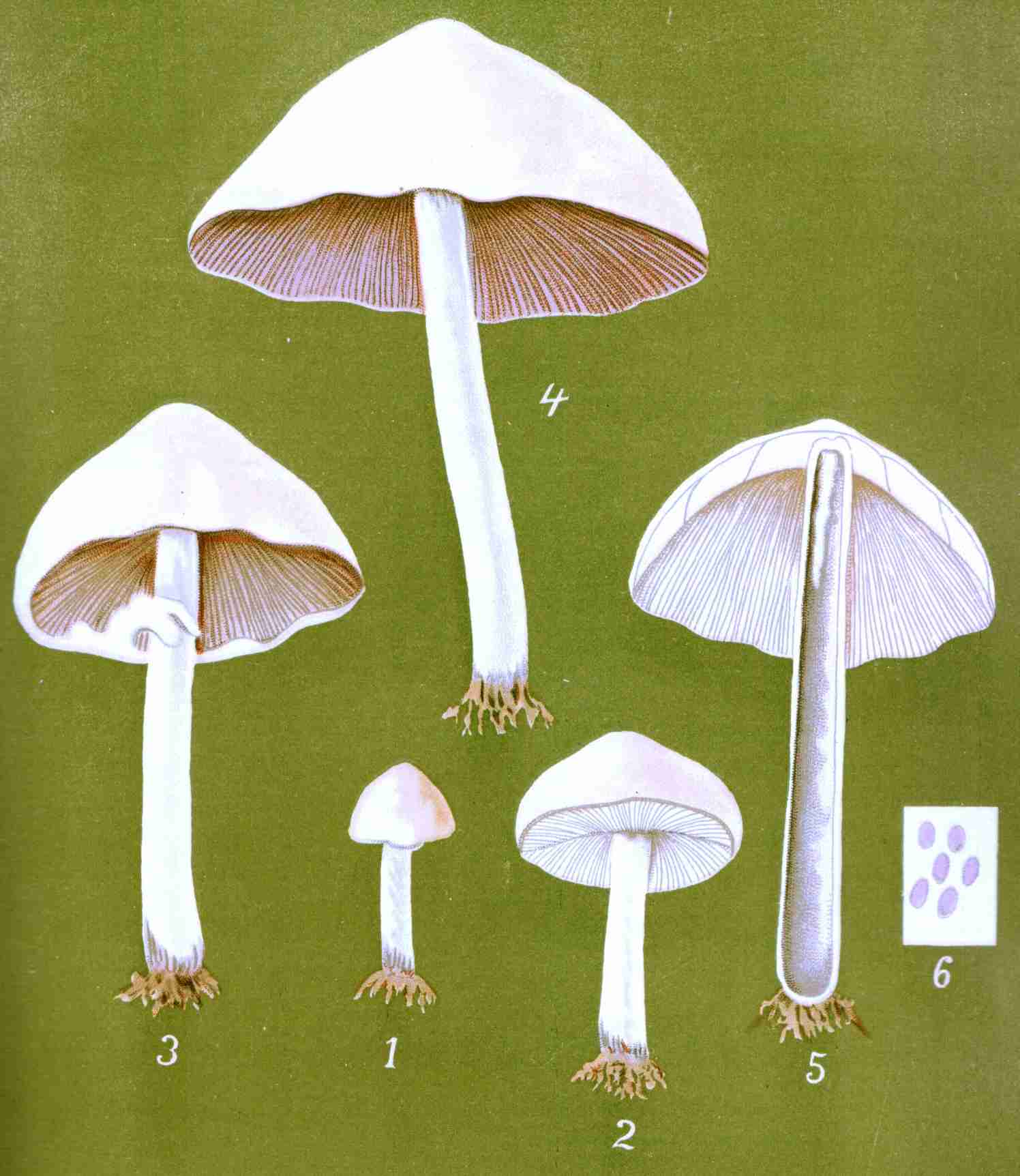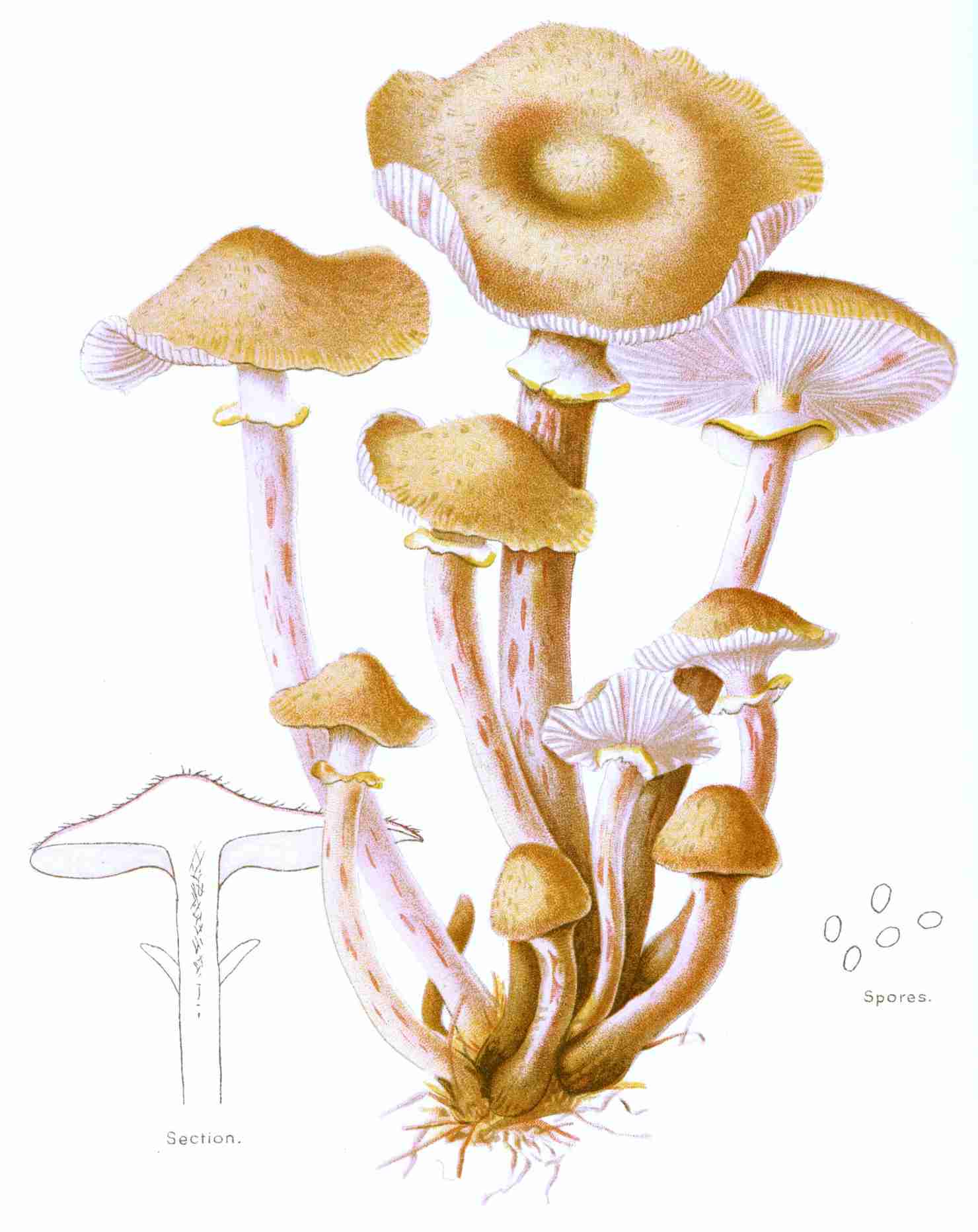 Mushroom gills, or lamellæ, anatomically considered, are composed, first, of a central portion, a prolongation of the hymenophore or flesh of the cap, more or less dense, sometimes so thin as to be scarcely perceptible; second, the hymenium or spore-bearing membrane covering the surfaces of this prolonged hymenophore. They are vertical, simple, equal, respectively, or more frequently alternating with shorter gills. They are often evanescent and putrescent, sometimes liquefying altogether. Their color is usually different from the upper surface of the cap, not always similar to that of the spores borne upon them, at least in youth; with age, however, they usually assume the color of the mature spore. The change of color of the gills according to the age of the plant is very important in the study of the Agaricini; it accounts for the white gills of certain species in youth, the pink in maturity, and the brown when aged.